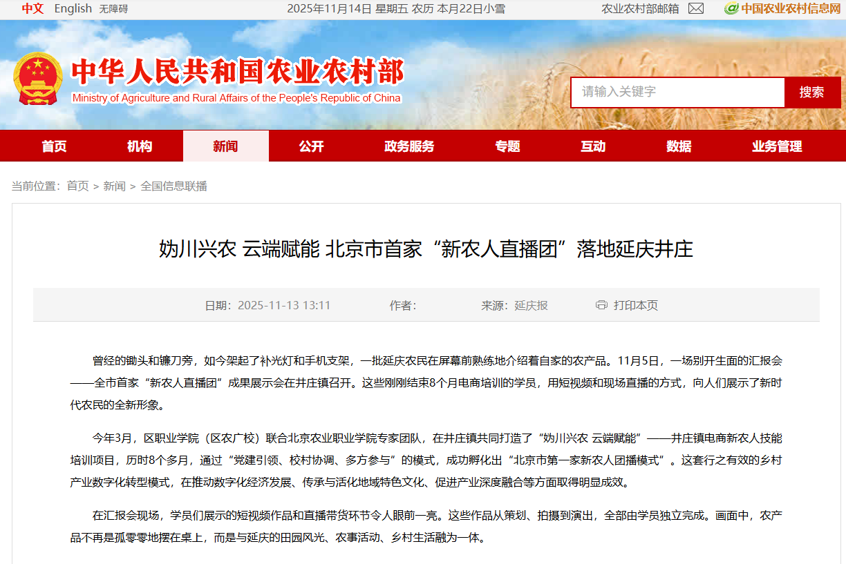 11月5日,全市首家“新农人直播团”汇报会在延庆区井庄镇举行。《延庆报》、中国农业农村信息网等媒体于近日对此事进行了跟踪报道。截至11月13日,该新闻已被农业农村部、网易、搜狐、农视网等媒体转载。