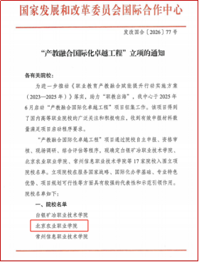 3月23日,国家发展和改革委员会国际合作中心正式发布《“产教融合国际化卓越工程”立项的通知》(发改国合〔2026〕77号),我校成功入围立项院校,成为17所入围院校中唯一一所农业类职业院校。项目由我校党委常委、副院长谷天刚担任负责人,旨在围绕学校构建的“1体2翼3服务4平台5工程”国际合作交流体系,系统推进各项建设任务。