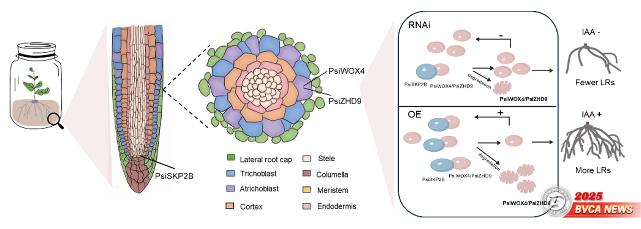 为揭示PsiSKP2B调控根系发育等分子作用机制,构建了PsiSKP2B的杨树遗传转化株系,发现PsiSKP2B是杨树侧根发育等正向调控因子。联合利用共表达网络分析以及酵母双杂交、蛋白免疫共沉淀、泛素化等分子生物学实验,发现PsiSKP2B能够提高根系生长素含量,泛素化降解PsiZHD9与PsiWOX4蛋白,正向调控杨树侧根发育。综上所述,本研究首次在木本植物中构建了从表型到基因、从组织到细胞的多层次调控框架,为今后林木根系遗传改良、植株形态建成、抗旱耐盐品种选育提供了新靶点与技术支撑。