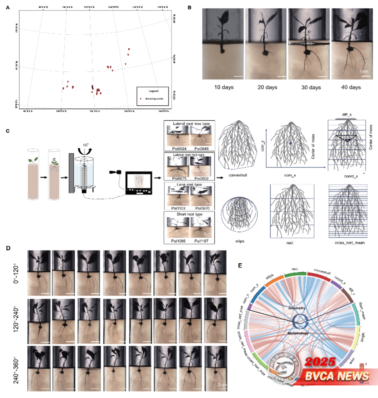 根系作为吸收树木水分与营养元素、维持形态结构稳定性的重要器官,其构型特征直接影响植物生长发育、抗逆能力与形态建成。然而,林木具有多年生、植株高大、根系结构复杂等生物学特点,特别是由于根系埋藏于地下,表型获取困难,其遗传调控机制在林木中长期以来研究不足。其根系表型的高通量无损数字化获取仍存在技术瓶颈,导致木本植物根系构型的遗传基础研究进展缓慢。为此,团队依托小叶杨种质资源群体(303份),整合3D成像技术与图像分割算法,开发了林木根系表型组学分析体系,系统分析了小叶杨种质资源群体根系表型特征,构建了包含96个微观性状的根系表型数据集。利用全基因组关联分析(GWAS)方法,揭示了小叶杨根系构型的遗传基础,鉴定了72个影响根系构型的关键基因,主要涉及细胞分裂、侧根形成、分生组织发育以及激素信号传导等生物学过程。特别是,发现编码F-box泛素连接酶基因PsiSKP2B与6个根系性状存在显著关联,表明其在杨树根系发育过程中的潜在重要功能价值。