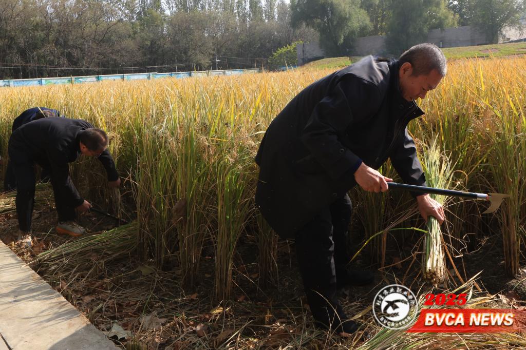 班子成员一同为活动开镰。金镰落下,稻穗归仓,这一庄重环节既标志着丰收活动序幕的开启,也体现了学校对劳动教育与农耕文化传承的重视。这片稻田从春日播种到夏日养护,再到如今的秋日丰收,凝聚着后勤师傅的悉心照料和师生们的辛勤汗水。随后,各二级学院收割队在后勤师傅的专业指导下展开收割竞赛。