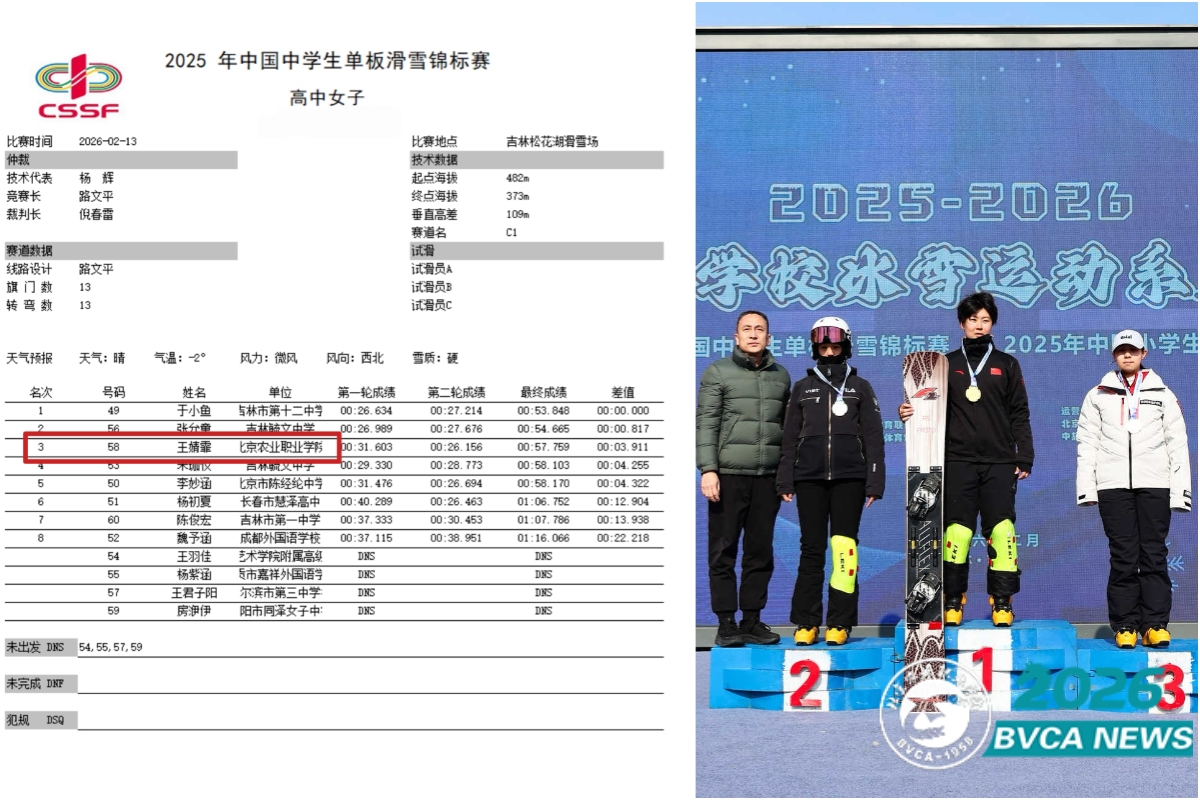 近日,2025年中国中学生单板滑雪锦标赛在松花湖滑雪场落幕。赛事由中国学生体育联合会主办,是国内中学生冰雪运动重要赛事,吸引全国258所学校近千名选手参赛。我校贯通宠物2411班学生王婧霏参加高中女子组赛事,稳定发挥,斩获季军,为校争光。