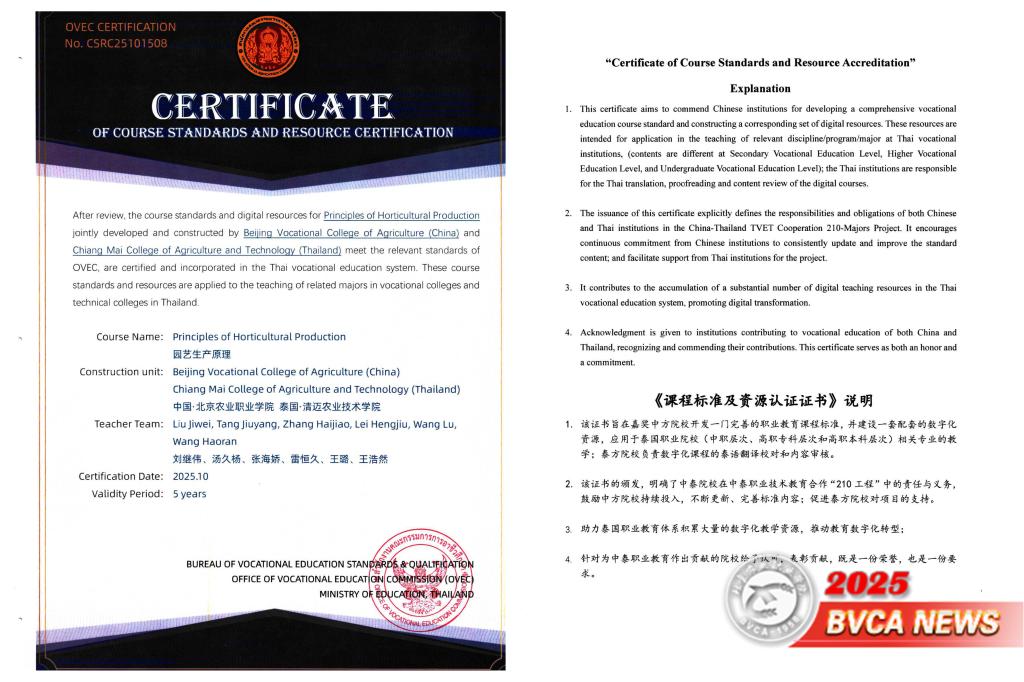由我校刘继伟、汤久杨、张海娇、雷恒久、王璐、王浩然六位教师组成的课题团队,与泰国清迈农业技术学院建设完成《园艺生产原理》课程标准和资源,获颁泰国教育部职业教育委员会课程标准与资源认证证书。