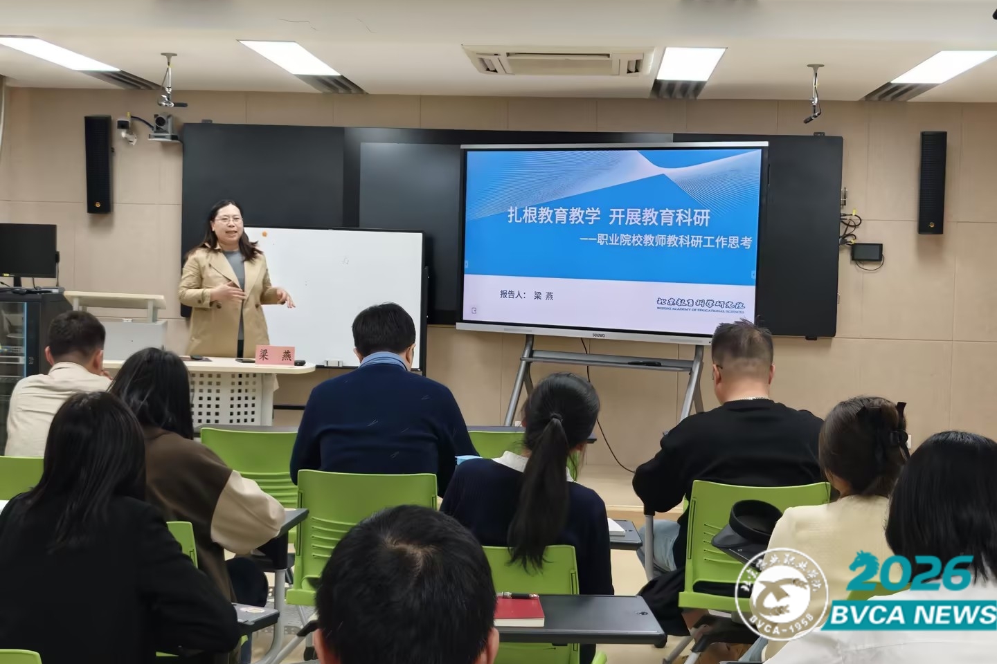 梁燕以“扎根教育教学,开展教育科研”为主题,结合《教育法》《教师法》及职业教育最新政策,阐释教科研对教师专业化发展的重要意义。她从教学学术理念、问题导向选题、显性与隐性科研路径等方面,讲解教科研开展方法,结合课程思政、督导评价、技职教育比较等案例,分享课题申报、成果凝练、教学成果奖打造的实操经验,引导青年教师立足教学实践,找准研究方向,破解科研难题。