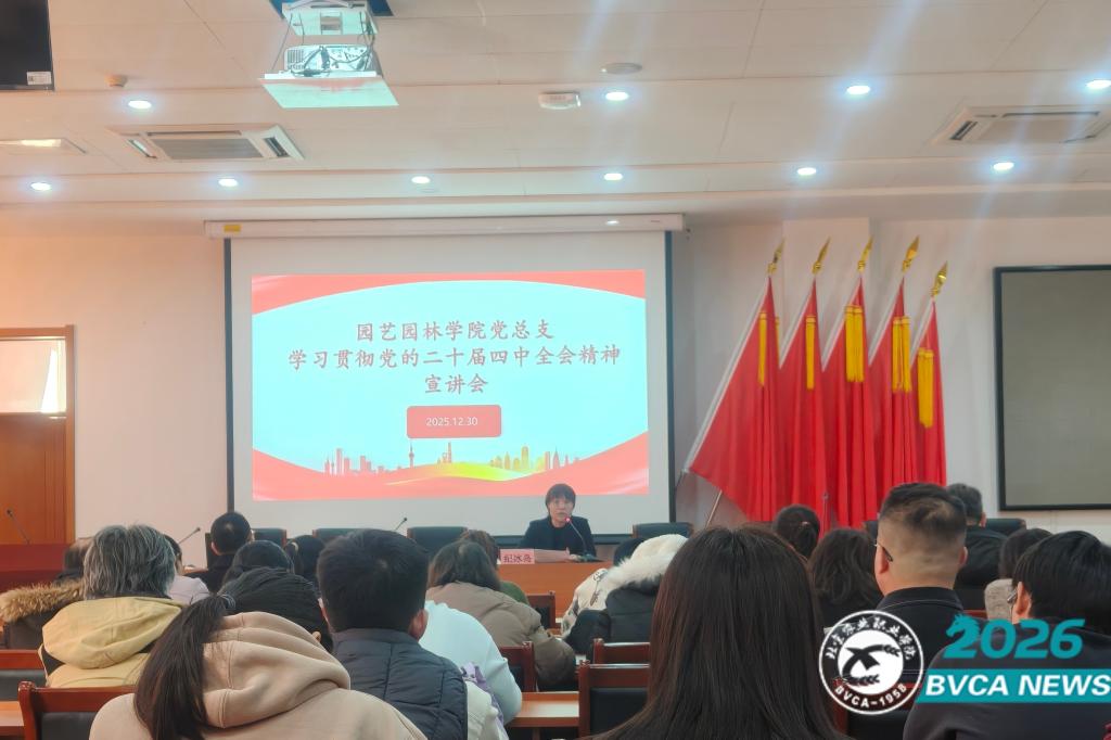 12月30日,园艺园林学院党总支组织召开了党的二十届四中全会精神专题宣讲会。党总支书记纪冰岛从深刻认识全会的重大意义、“十五五”时期的国内外形势、全会的核心理念和未来职业院校的发展方向等四个方面,全面系统地进行了解读,并结合学院实际对贯彻落实全会精神工作作出部署。