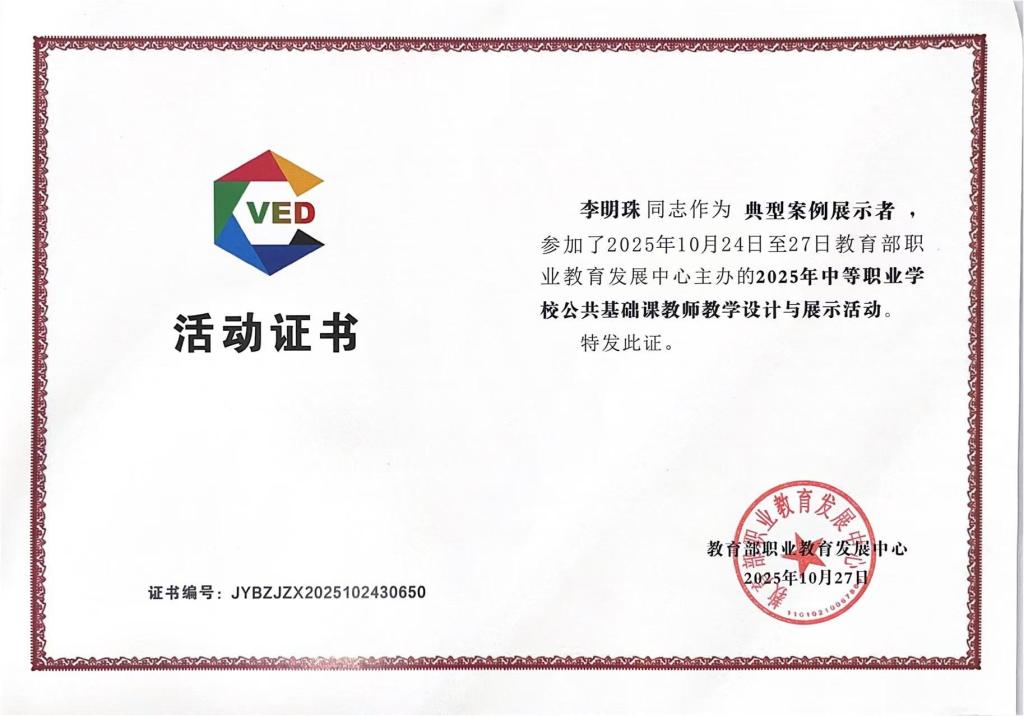2025年10月25日至26日,由教育部职业教育发展中心主办的2025年全国中等职业学校公共基础课教师教学设计与展示活动在青岛举行。我院李明珠老师作为北京市思政学科代表之一参赛,凭借扎实的教学功底,创新的教学设计和出色的现场表现,荣获“典型案例展示者”(一等奖)的优异成绩!