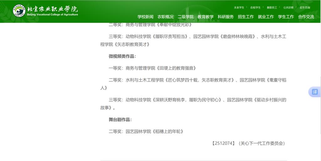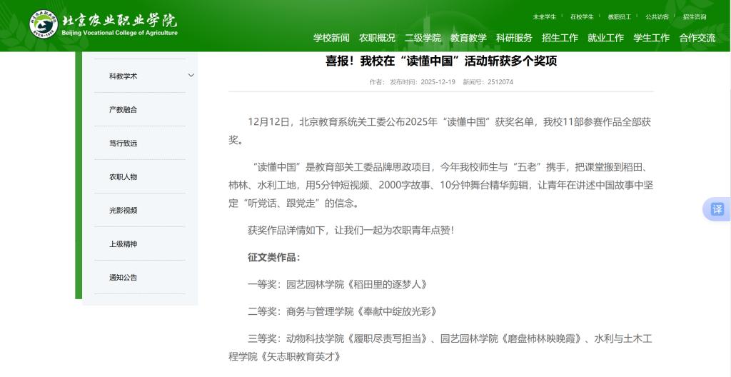 近日,北京教育系统关心下一代工作委员会(以下简称“市教育系统关工委”)正式公布2025年“读懂中国”活动获奖名单。我院学子精心创作的征文作品《矢志职教育英才》荣获市级三等奖,微视频作品《匠心筑梦四十载,矢志职教育英才》荣获市级二等奖,充分展现了我院在青年学生思想政治教育、师德师风传承及校园文化建设方面的扎实成效。