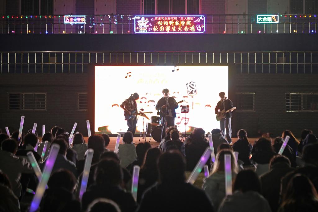 活动现场,动物科技学院党总支副书记、副院长张凡建、党总支副书记任春、学办全体老师和400多名同学参加了活动。星光点点、微风习习,师生们齐聚一堂共同合唱经典红歌、校园歌曲等。