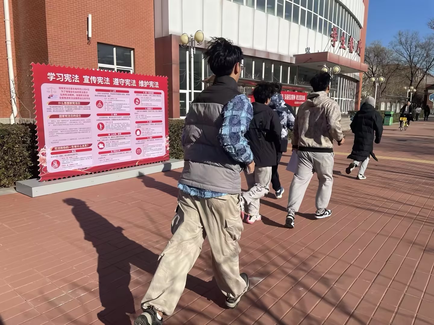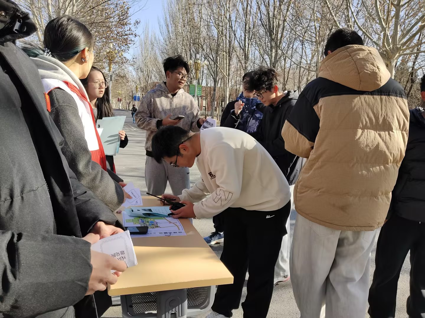 活动现场,主持人带领学子回顾“一二·九”运动的峥嵘历史,阐明活动“奔跑竞智”传承红色基因的目的,以“奔跑闯关+知识竞答”为主要形式,在图书馆、操场、体育馆设置三个打卡点,5人组成的参赛小组需全员同行,完成答题后方可通关。随着活动开始的一声令下,各参赛小组有序奔赴赛场,他们分工协作、稳步推进,在答题点专注完成“一二·九”运动历史、学生手册知识答题任务。终点区域,各小组陆续冲线后,裁判组随即依据规则,严谨完成到达时间记录与答题试卷核对工作。志愿者们全程坚守岗位,保障活动高效有序开展。